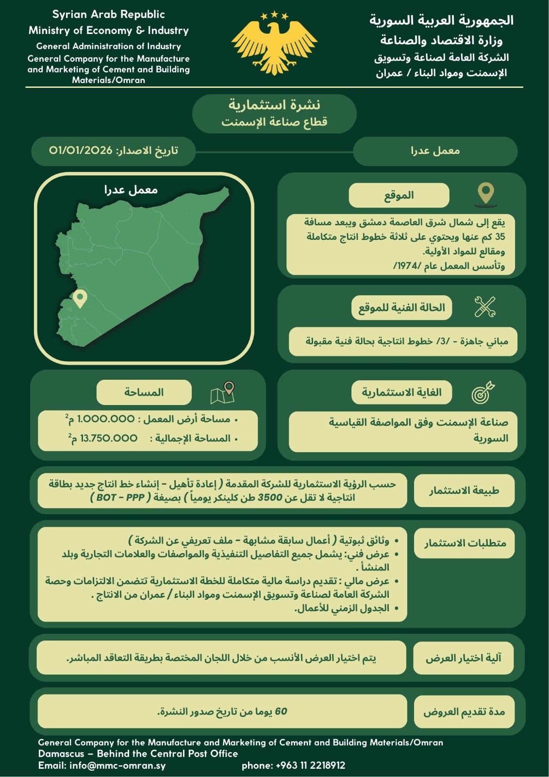 استثمر في مصنع عدرا للإسمنت مع خطوط إنتاج متكاملة في قلب سوريا. فرصة رائعة للنمو والتطوير في قطاع البناء. #فرص_استثمارية_في_الشركة_العامة_لصناعة_وتسويق_الإسمنت_عمران #اقتصاد_سوريا المكتب الإعلامي
